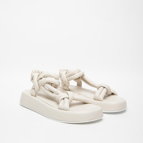 Sandalo a fasce imbottite in morbida pelle burro. Nodo laterale ed elastico dietro il tallone. Sottopiede in pelle leggermente imbottito per una maggiore comodità di utilizzo. Suola rivestita in pelle burro tono su tono con la tomaia. Altezza tacco di 40 mm con plateau di 20 mm. Dettagli in coordinato. Vestibilità regolare.